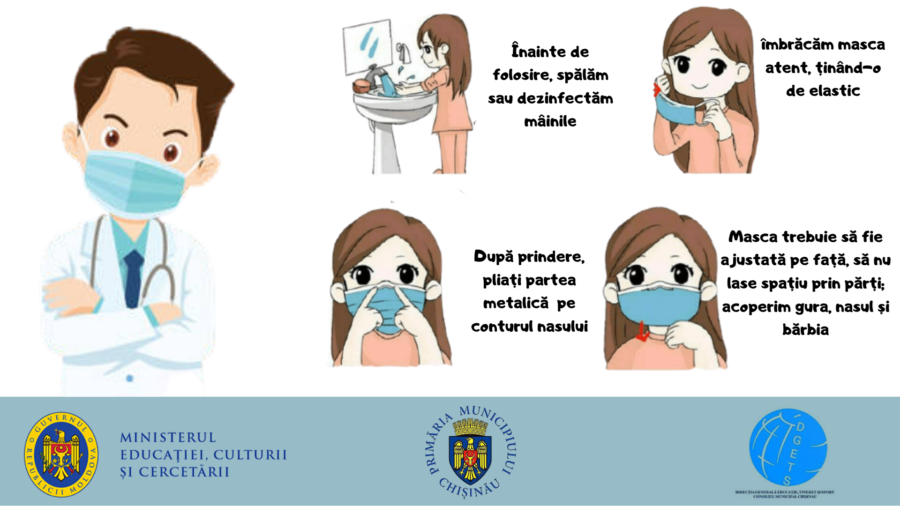 - Spălăm/dezinfectăm mâinile înainte să scoatem masca;